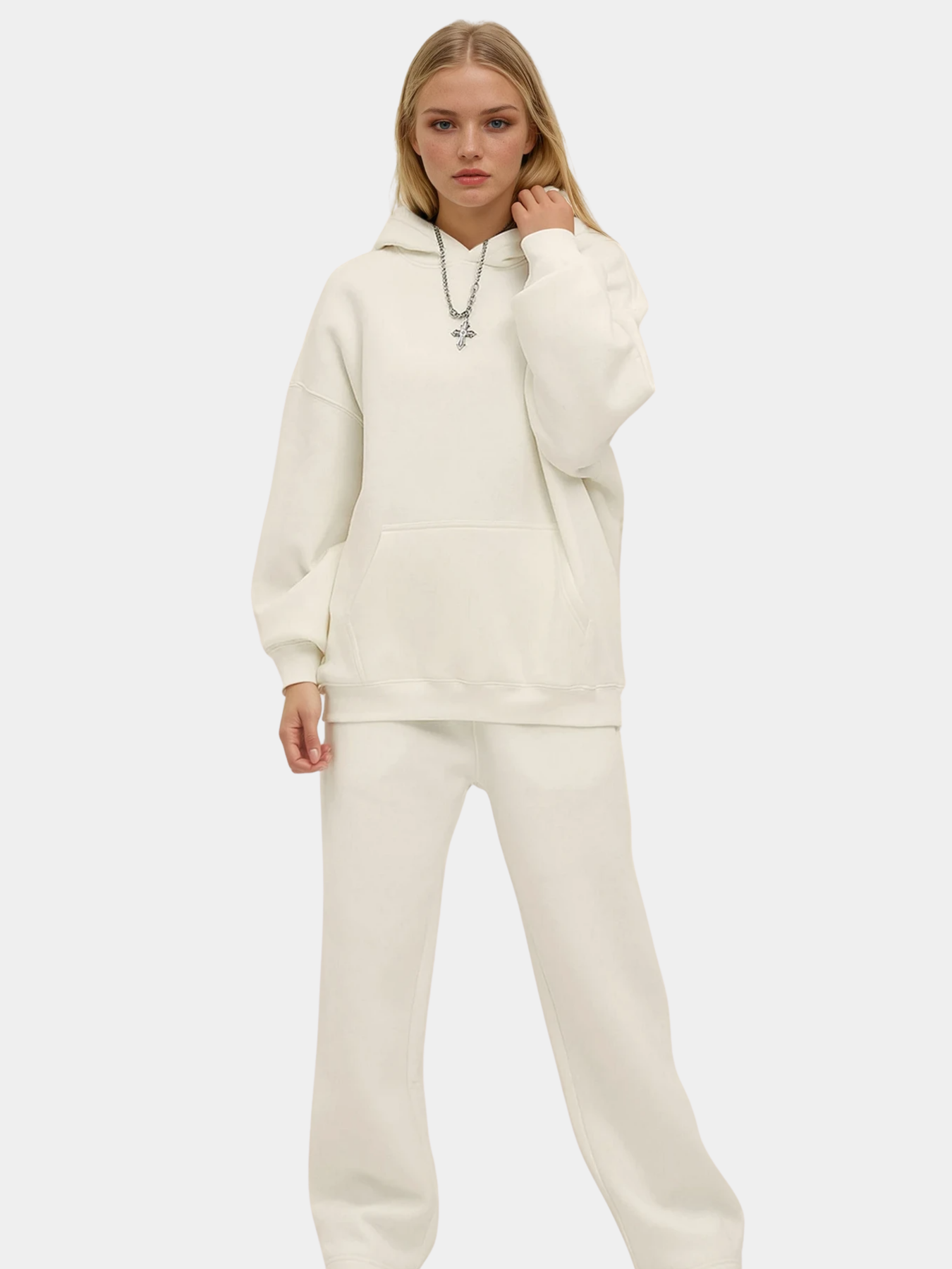 With its pure white hue and minimalist cut, it offers a polished yet cozy look—perfect for both lounging and streetwear.